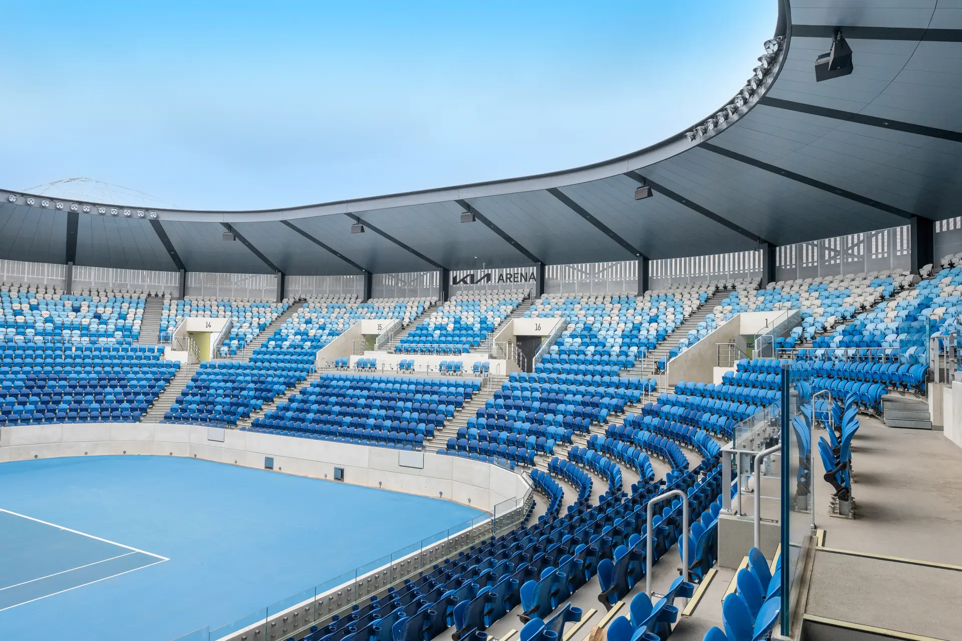 Kia Arena was a key component of the $271.5 million third stage of the Melbourne Park Redevelopment, completed in 2021. The project was a collaboration between NH Architecture, RWA Sports Architecture, and Snøhetta, with landscape design by ASPECT Studios. The arena is partially sunken into the ground and features an open-roof structure that provides shade and weather protection for most spectators, although it does not have a retractable roof.
